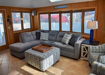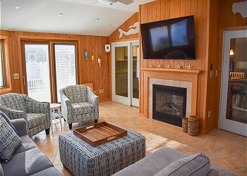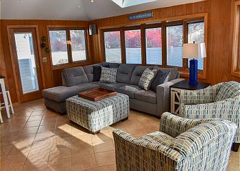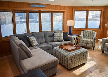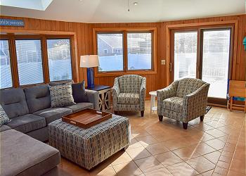 A sunny den with full windows and screens provides a peaceful place to unwind, read a book, or enjoy morning coffee while taking in the natural light and gentle sea breeze.